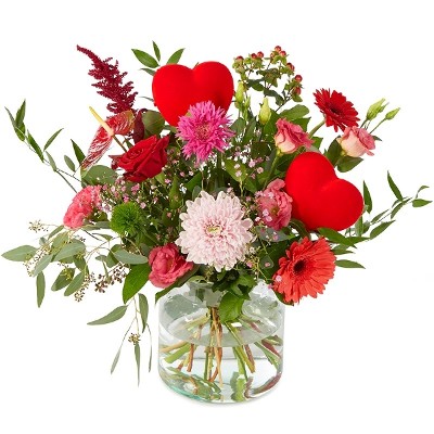 Ein von Hand gebundener Blumenstrauß für diejenigen, die nach einem einzigartigen romantischen Geschenk suchen. Er umfasst Amaranth, Eustoma, Nelke, Hypericum, Chrysantheme, Gerbera, Löwenmäulchen, Gypsophila, saisonales Grün und Herzdeko. Deine Bestellung wird liebevoll von einem lokalen Florist:innen erstellt und von Hand ausgeliefert. Vase nicht enthalten.